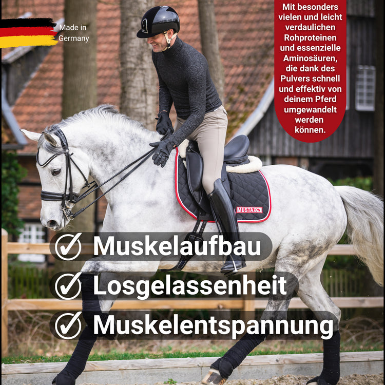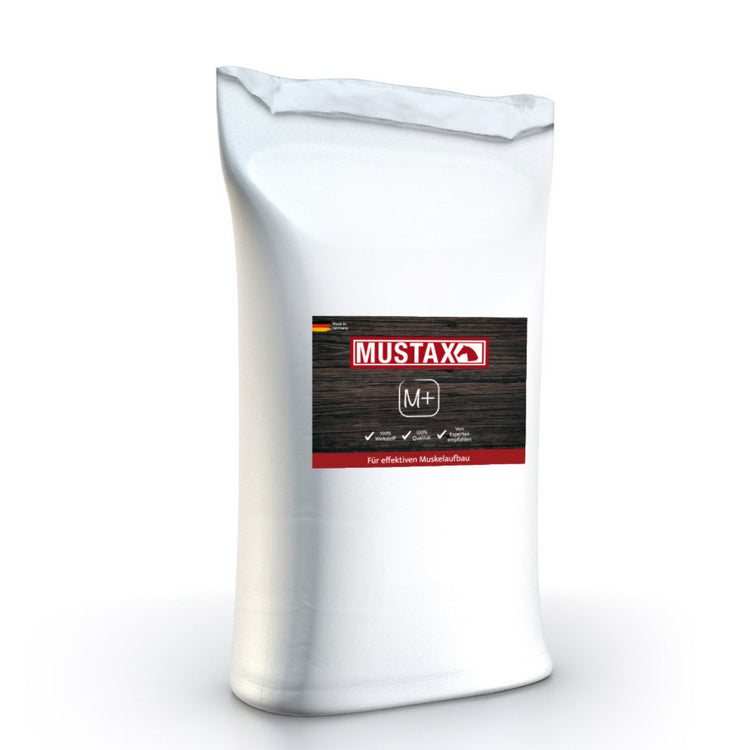 - MUSTAX M+ contains a particularly high amount of easily digestible raw proteins and essential amino acids, which thanks to the powder can actually be converted quickly and effectively by your horse.